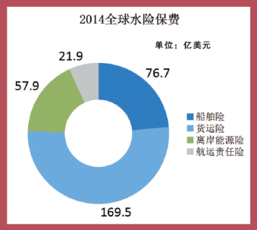 来自IUMI的统计数据显示,2014年全球水险保费合计326亿美元,同比下降3.2%,其中船舶险保费76.7亿美元,货运险保费169.5亿美元,离岸能源险保费57.9亿美元,航运责任险保费21.9亿美元。