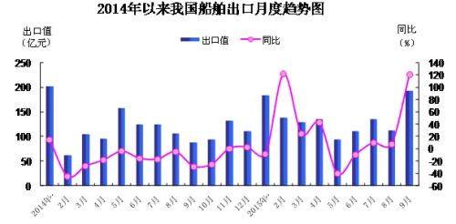 (一)月度出口值先抑后扬,9月当月出口创2014年2月以来新高。今年以来,我国船舶出口值在1月份冲高至184.1亿元高位后连续4个月回落,6月份开始震荡上扬,9月当月出口值为192.6亿元,为2014年2月以来新高,同比增长1.2倍,环比增长71.3%(下图)。