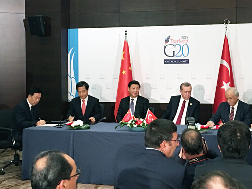 中远集团 2015年11月14日在土耳其安塔利亚,中远集团马泽华董事长与招商局集团李建红董事长和中投公司张勍副总经理一同代表中方联合体与土耳其Fiba 集团签署了《伊斯坦布尔Kumport港口项目交割协议》,该协议的签署充分体现了中远集团等中资企业共同落实国家“一带一路”倡议的合作精神。正值二十国集团峰会在土耳其的海滨城市安塔利亚召开之际,国家主席习近平与土耳其总统埃尔多安见证了签字仪式。