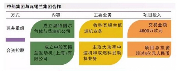 中国船舶报 10月28日,中国船舶工业集团公司与芬兰瓦锡兰集团合资成立的中船瓦锡兰发动机(上海)有限公司正式开工建设,该公司建成后将主攻大功率中速机与双燃料发动机市场。早在今年1月,中船集团还通过与瓦锡兰在瑞士合资成立的温特图尔气体与柴油机公司(WinGD),完成了对后者低速机业务的收购。短短一年时间不到,中船集团先后通过兼并重组和合资控股两种资本运作方式,完成了动力装备领域中速机、低速机、双燃料机等高端产品的国际化布局。