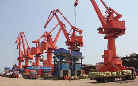 目前,董家口港区的吞吐能力突破2.2亿吨,建成堆场300多万平方米,从试运营到成为亿吨大港,只用了5年时间。卓越的硬件,让青岛港的“大船战略”得以顺利实施。十二五期间,世界上最大的矿石船舶、集装箱船舶在青岛港实现了常态化靠泊,货物总吞吐量和集装箱吞吐量稳居世界大港第七位。青岛港董家口矿石码头公司总经理杨风广告诉记者:“这几年来发展了我们的保税业务、期货交割业务、混矿业务、配矿业务以及我们破碎、筛分等业务,致力于打造干散货分销中心。”