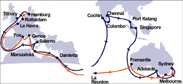 Tilbury - Hamburg - Rotterdam - Le Havre - Fos - Genoa - Damietta - (Suez Passage) - Pointe de Galets - Fremantle - Melbourne - Sydney - Adelaide - Singapore - Pt. Kelang - Chennai - Colombo - Cochin - (Suez Passage) - Damietta - Malta - Salerno - Tilbury