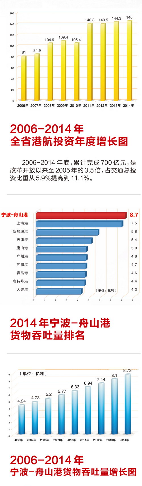 全国首条30万吨级人工航道——虾峙门航道、全国最大原油码头——大榭实华二期45万吨原油码头、北仑四期集装箱码头……十年来,浙江的大港梦一张蓝图绘到底、一任接着一任干。自2008年起,全省港航建设投资连年破百亿,“十二五”建设投资达700亿元,是“十一五”的1.4倍。