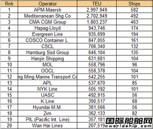 在上榜的中国大陆班轮公司中,中远集运排名第6位,中海集运排名第7位,海丰国际排名第23位,泉州安盛船务排名第28位,中谷新良海运排第31位,中外运集运排名第37位,上海海华轮船排名第63位,广西鸿翔船务排名第67位,上海锦江航运排名第73位,宁波远洋排名第84位,天津海运排名第85位,福建中航海运排名第100位。