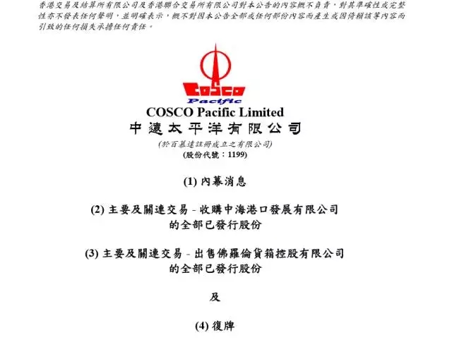 中远太平洋以76.3亿元人民币收购中国海运(香港)控股有限公司和中海集运持有的码头资产——中海港口发展有限公司;以77.8亿元人民币将旗下佛罗伦公司资产出售于中海集运。交易完成后,中远太平洋将成为专注于全球码头业务的上市平台。