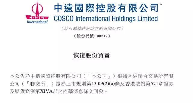 中国远洋:A股股票自2015年12月14日起暂不复牌,待上海证券交易所审核并发布修订公告后另行通知复牌时间;H股股票自2015年12月14日(星期一)上午九时复牌。