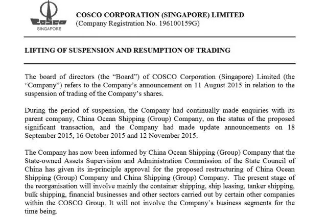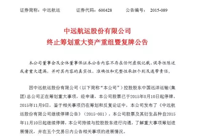 中远航运(A股):2015年12月15日(星期二)开市起复牌。