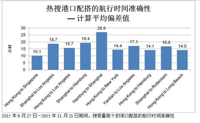 搜索量前十的港口配搭,其平均偏差范围为 10.1—26.9 小时