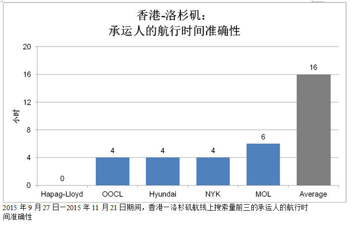就香港—洛杉矶港口配搭而言,赫伯罗特的航行时间准确性第一,航行时间偏差为零。东方海外、现代商船和日本邮船的航行时间准确性居第二,平均偏差为4小时。商船三井的航行时间准确性居第三位,平均偏差为6小时。市场平均航行时间偏差为16小时。