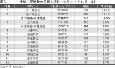 根据Alphaliner统计,截至11月1日,中远集运拥有集装箱运力86.57万TEU,市场份额约为4.3%,排名全球第六;中海集运拥有集装箱运力69.99万TEU,市场份额约为3.5%,排名全球第七。双方集运业务合并后,运力将达到156.56万TEU,市场份额约为7.8%,排名为全球第四(见表3)。7.8%的市场份额约为“状元”马士基航运的一半、“榜眼”地中海航运的六成、合并总统轮船后的“探花”达飞轮船的七成,但比目前排名第四的长荣海运高出约七成规模。