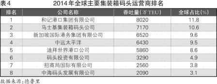 而从德鲁里对去年全球集装箱码头运营商排名来看(见表4),中远与中海两家集团的码头资产整合后,已经排名全球第一。