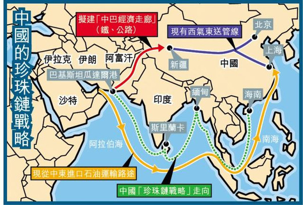 针对于这四面环敌的现象,中国并未坐以待毙,通过拿下巴基斯的瓜达尔港和斯里兰卡的科伦坡港,形成犄角之势,同时配以中巴铁路,实现由国内新疆喀什直达霍尔木兹海峡的战略通道,并伴以珍珠链战略,减弱美军同印度对西行航线的遏制,使得美国美国在亚洲部署的群岛封锁战略有所失效。参看文章《振奋:中国两大战略保石油航线,美国千亿军事基地打水漂》