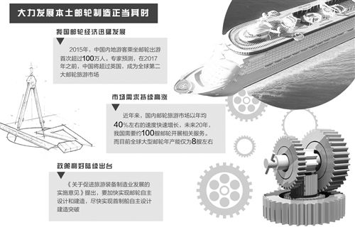 “目前全球大型邮轮年产能仅为8艘左右。”船舶工业专家介绍,近年来国内邮轮旅游市场以年均40%左右的速度快速增长,未来20年,我国需要约100艘邮轮开展相关服务。由于全球邮轮市场正处于供求失衡的尴尬局面,依托国内庞大的市场需求,大力发展本土邮轮制造正当其时。