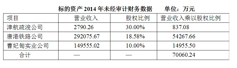 公告显示,唐山港拟收购三项标的资产2014年未经审计的营业收入合计为70060.24万元,占唐山港2014年经审计的营业收入(512662.71万元)的比例为13.67%,不超过50%,不构成重大资产重组(见表)。