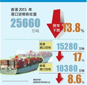特区政府统计处日前公布的数据显示,香港2015年全年的港口货物吞吐量按年下跌13.8%,为25660万吨。当中,抵港及离港港口货物按年分别下跌17%及8.6%,为15280万吨和10380万吨。