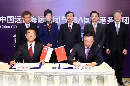 中远海运集团网站 继2016年2月18日签署战略合作框架协议之后,中国远洋海运集团与PSA国际港务集团(PSA International)合作又有新进展。3月28日,中远太平洋与新加坡港务集团(PSA Corporation Limited)通过下属合资公司在上海签署有关共同投资新加坡大型集装箱码头的合作协议。中国交通运输部副部长何建中、新加坡交通部高级政务部长杨莉明女士、中国远洋海运集团董事长许立荣、总经理万敏及PSA国际港务集团总裁陈聪敏的见证了协议的签署,中远太平洋总经理邱晋广和PSA国际港务集团东南亚区域总裁王金榜代表双方签署了协议。