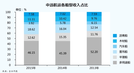 半潜船市场受油价暴跌影响,对海上钻井平台等海工装备的运输需求也大幅萎缩,去年下半年以来,已逐渐影响到半潜船承运平台项目的执行。现货市场低迷,手持较多长期货运订单的半潜船企业暂且能维持平稳经营。去年,中远航运半潜船共实现船队营业收入7.88亿元,占船队营业收入12.62%;船队营业利润1.95亿元。