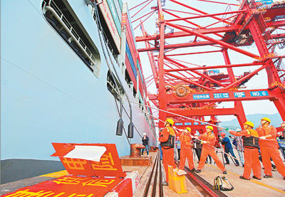 5月22日,随着载箱量为1.3万标准箱的大型集装箱船“中远丹麦”轮在宁波舟山港穿山港区远东码头平稳接入港口电网,浙江省首个高压变频船舶岸电项目正式投入使用。