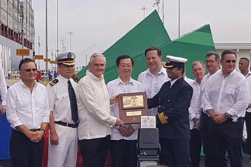 巴拿马运河新船闸开通启用仪式分上下午分别在大西洋一侧的AGUA CLARA船闸和太平洋一侧的COCOLI船闸举行。当天上午,在AGUA CLARA船闸一侧举行的首航船舶欢迎仪式上,巴拿马运河管理局局长吉哈诺代表巴拿马总统向中远海运巴拿马轮颁发了纪念牌。