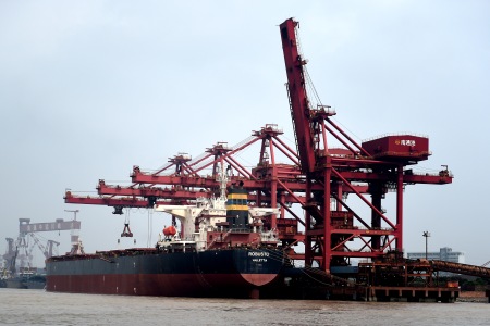 超大型散货轮“罗布斯(ROBUSTO)”轮在南通江海码头404泊位进行卸货作业。陈福广摄