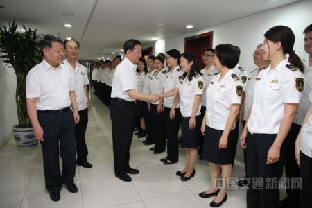 图为杨传堂、李小鹏慰问部海事局干部职工。