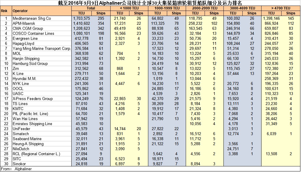 中国航贸网 9月9日,Alphaliner公司发布最新全球30大集装箱班轮租赁船队细分及运力排名。前30大集装箱班轮租赁船队共计2253艘。