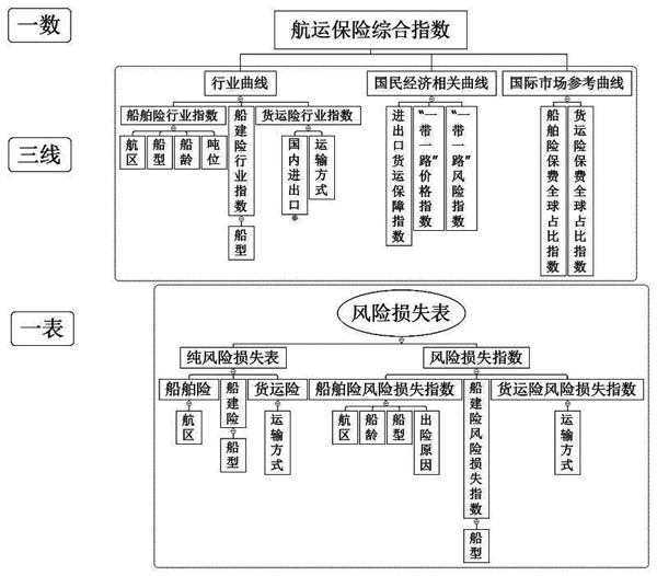 “三线”是指行业曲线、国际市场参照曲线及国民经济参照曲线。其中行业曲线区分船舶险、货运险和船建险,反映单一险类及其细分领域的价格变化趋势。船舶险按照航区、船型、船龄、吨位进行细分,货运险按照国内、进出口、海陆联运运输方式进行细分。国际市场参照曲线主要反映国内、国际两个市场航运保险规模的比较关系。国民经济参照曲线主要反映航运保险服务实体经济提供风险保障的贡献,分为进出口覆盖比例和“一带一路”支持力度两个方面。