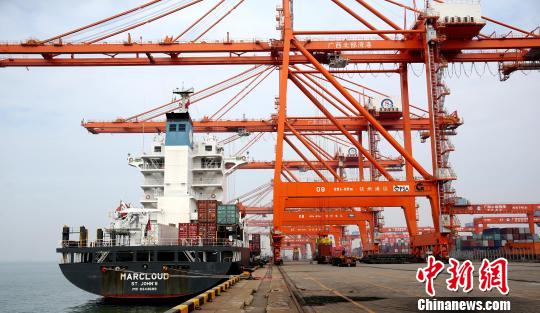 图为一艘外轮停靠在广西钦州保税港区国际集装箱码头卸货。 曾开宏 摄