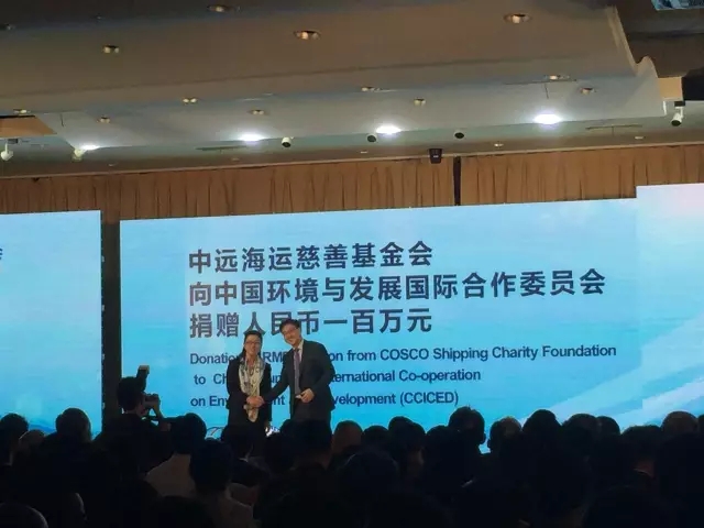 当天还同期举行了中远海运慈善基金会向中国环境与发展国际合作委员会捐赠100万元人民币的仪式。此笔基金将用于维护海洋环境、推行绿色航运以及可持续发展等方面的研究。