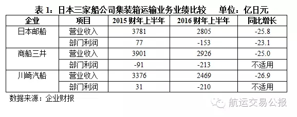 当天,三家日本船公司还都发布了各自2016财年上半年(4—9月)的财报,情况几乎都比此前预测的差(见表1)。