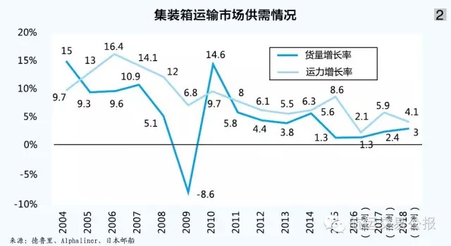 总体而言,尽管亚欧航线的运价正在走出低谷,南北航线的运价有复苏迹象,但是因为不管投入超大型船舶的竞争,全球班轮运输市场的运力供需失衡状况不断恶化(见图2),费率也同比下滑,因此,三家船公司的班轮运输业务业绩长期位于低谷。