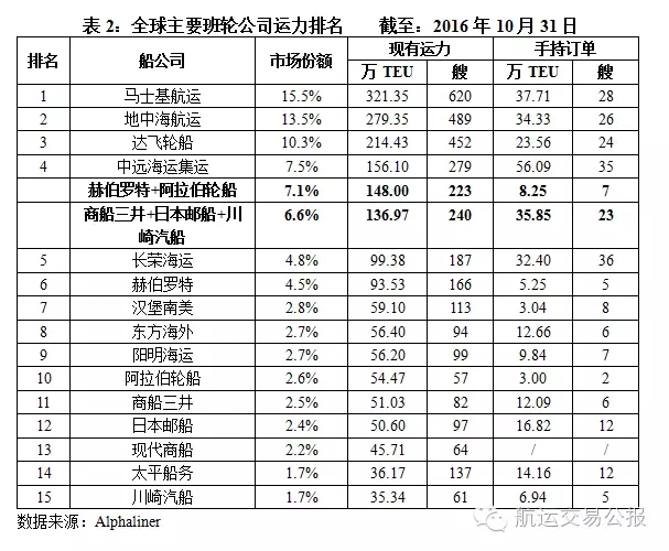 三家公司的班轮运输业务合并之后,运力规模显而易见得以迅速集中,合并后的运力规模为136.97万TEU、240艘,全球排名位于马士基航运、地中海航运、达飞轮船、中远海运集运以及赫伯罗特(阿拉伯轮船)之后列第6位,全球份额为6.6%。除了前三甲之外,与第四位、第五位的规模差距并不明显,基本上稳居班轮运输市场第二集团军。