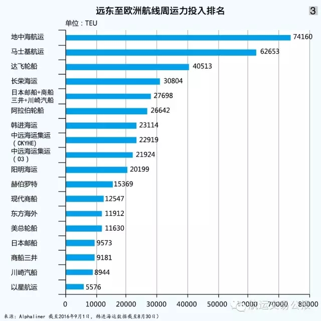在全球两大主干航线上,三家船公司班轮运输业务合并之后,市场投入运力排名上升明显。根据Alphaliner截至9月1日的数据,在远东至欧洲航线上(见图3),日本邮船投入周运力为9573TEU,市场排名第14位;商船三井投入周运力为9181TEU,市场排名第15位;川崎汽船投入周运力为8944TEU,市场排名第16位。三家船公司论单一投入而言,在远东至欧洲航线上均处于排名后段;三家船公司合并后,周运力投入达到27698TEU,市场排名为第6位,占远东至欧洲航线总体运力投入的6.99%。