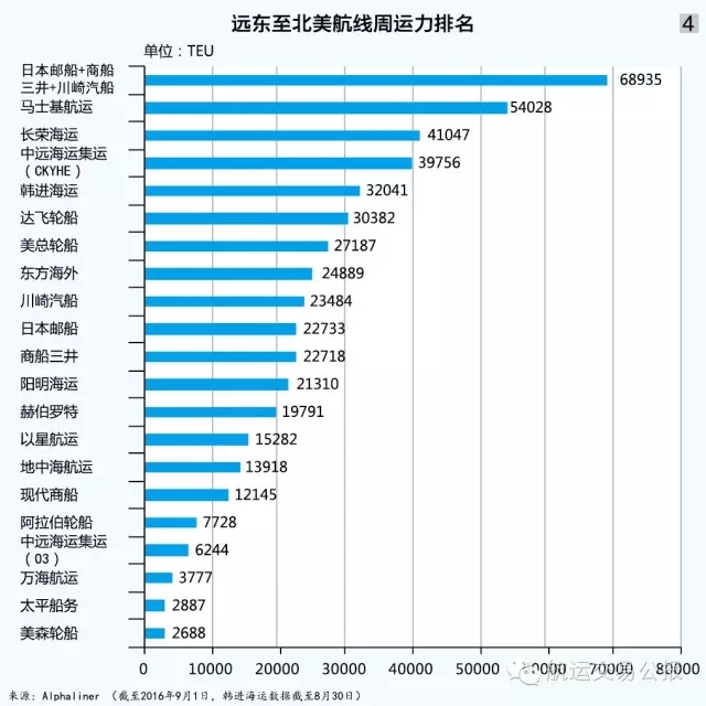 根据Alphaliner截至9月1日的数据,在远东至北美航线上(见图4),川崎汽船投入周运力为23484TEU,市场排名第8位;日本邮船投入周运力为22733TEU,市场排名第9位;商船三井投入周运力为22718TEU,市场排名第10位。可以看出,远东至北美航线属于三家日本船公司“重金”投入的航线,其运力投入排名较为靠前。三家船公司合并后,在远东至北美航线的周运力投入达到68935TEU,一跃成为这一航线的最大承运商,占远东至北美航线总体运力投入的15.42%。