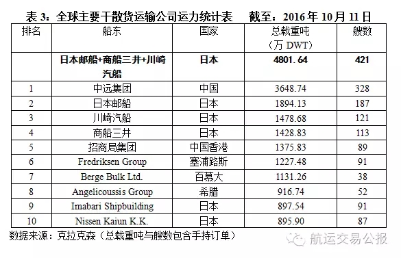 以克拉克森截至10月11日的最新数据(见表3),日本三家船公司的干散货运力排名居于世界前列,日本邮船以1894.13万DWT的运力规模排名全球第2,川崎汽船以1478.68万DWT的运力规模排名全球第3,商船三井以1428.83万DWT的运力规模排名全球第4。一旦三家船公司的干散货运输业务得以合并,其运力规模将达到4801.64万DWT,排名全球第1,超过目前排名全球第1的中远集团约31个百分点。
