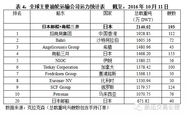 以克拉克森截至10月11日的最新数据(见表4),在全球主要油运公司的运力排名中,商船三井以1468.20万DWT的运力规模排名全球第4位,日本邮船以971.82万DWT的运力规模排名全球第20位。一旦三家船公司的油轮运输业务得以合并,仅商船三井和日本邮船的运力规模就达到2140.02万DWT,排名将成为全球第1,超过目前排名全球第1的招商局集团约11个百分点。