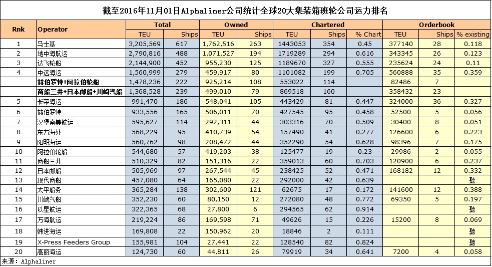 截至11月01日全球20大班轮公司运力排名发布