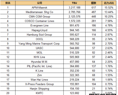 国际船舶网 Alphaliner最新运力数据显示,截止2016年11月4日,全球班轮公司运力100强中排名前三的分别是马士基航运、地中海航运和达飞轮船。第四名到第十名依次为:中远集运、长荣海运、赫伯罗特、汉堡南美、东方海外国际、阳明海运和阿拉伯联合航运,全球班轮公司运力排名20的公司总运力为1707.15万TEU,占集装箱总运力的82.34%。