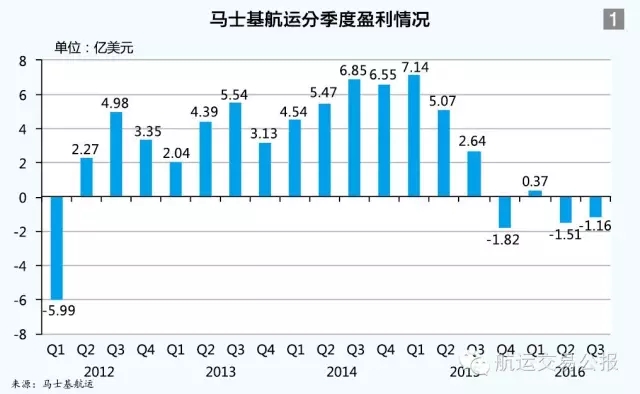 航运交易公报 三季度,马士基航运实现营业收入53.59亿美元,同比下降11%;实际亏损1.16亿美元,同比下降3.8亿美元(见图1)。对于全年业绩,马士基航运预计实际利润将显著低于去年的13亿美元,且可能出现亏损。马士基航运上一次全年亏损出现在2011年,亏损达5.53亿美元。