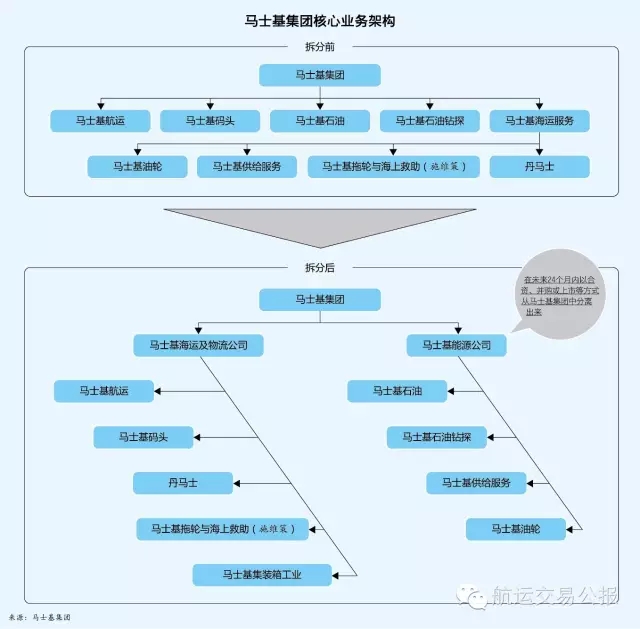 马士基集团6月23日起对集团的战略和架构进行评估,旨在推动新增长,增加灵活性和协同配合,为股东创造最大价值。9月22日,马士基集团宣布将业务重组为两个独立的板块:航运物流板块和能源板块。航运物流板块将由马士基航运、马士基码头、丹马士、马士基拖轮和海上救助(施维策)和马士基集装箱工业公司组成;能源板块将由马士基石油、马士基石油钻探、马士基供给服务和马士基油轮组成。