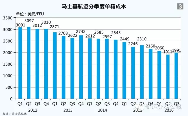 三季度,马士基航运货量同比增长11%(见图2),实现市场份额的增长。究其原因,马士基航运认为,主要是因韩进海运申请破产保护带来的货量增加,及越来越多的客户希望与财务状况稳健的班轮公司合作,同时,也由于东向航线货量的增加。