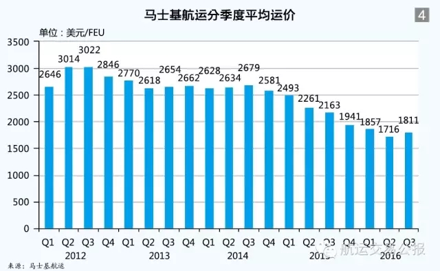 三季度,马士基航运单箱成本同比下降13.8%(见图3),但货量增长和单箱成本降低并没因此而盈利(因为运价过度低迷)。三季度,马士基航运的平均运价同比下降16%(见图4),由此导致三季度营业收入同比下降11%至53.59亿美元。