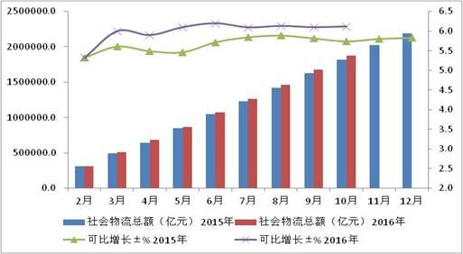 1-10月,全国社会物流总额为187.2万亿元,按可比价格计算,同比增长6.1%,增速比上年同期提高0.4个百分点,与前三季度基本持平,但比上半年回落0.1个百分点。进入10月,物流需求延续了稳中有进的发展态势,社会物流总额增速保持较快水平,呈现稳中趋升的发展态势。