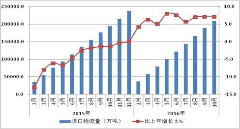 ---进口物流需求小幅回暖。1-10月,进口物流总额8.3万亿元,比上年同期下降1.8%,降幅继续收窄,比前三季度收窄0.5个百分点。进口物流量增速保持平稳增长,比上年同期增长7.1%,增速与前三季度基本持平。从当月情况看,10月当月进口物流总额0.9万亿元,增长3.2%,增速比上月加快1.0个百分点。