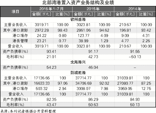 本次交易拟置入的钦州盛港资产包括钦州港大榄坪南作业区7号、8号泊位及金谷港区勒沟作业区13号、14号泊位;北海港兴资产包括铁山港西港区北暮作业区5号、6号泊位;防城胜港资产包括防城港港20万吨级码头、402号泊位、406—407号泊位。
