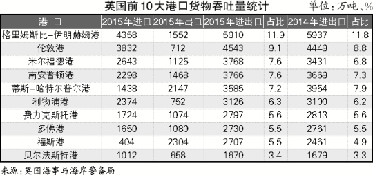 利物浦港是英国北部最大的港口,也是英国第三大集装箱港。2015年英国港口数据显示,利物浦港是英国第六大港口,完成货物吞吐量3126万吨,占整个英国港口货物吞吐量的6.3%,相较2014年的3100万吨货物吞吐量,同比维稳(见表)。