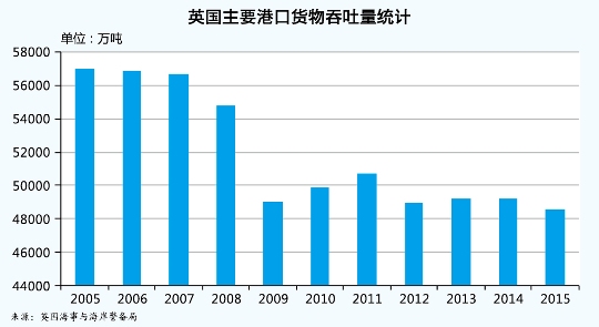 但另一个现实是,利物浦港二期码头投入运营之时适逢港口增长乏力期,英国主要港口货物吞吐量呈负增长(见图),新码头能否发挥其应有的作用尚需期待。