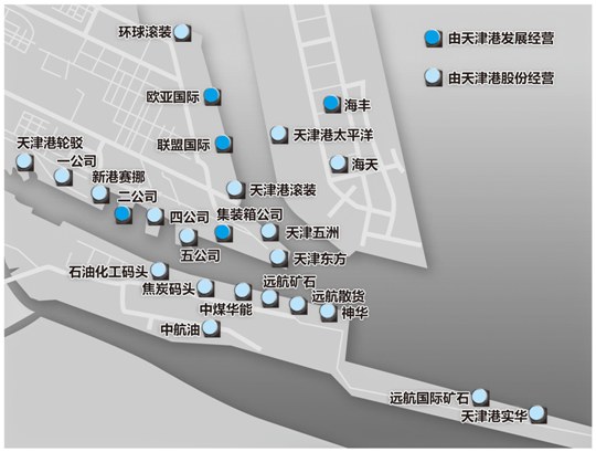 天津港是中国北方最大的综合性港口,拥有各类泊位总数173个,其中万吨级以上泊位119个,主要由天津港股份和天津港发展经营。截至去年年底,天津港发展和天津港股份共拥有70个泊位。其中,集装箱泊位23个(运营天津港内所有集装箱码头);散杂货泊位47个。两家上市企业具体经营泊位各有分工(见图)。
