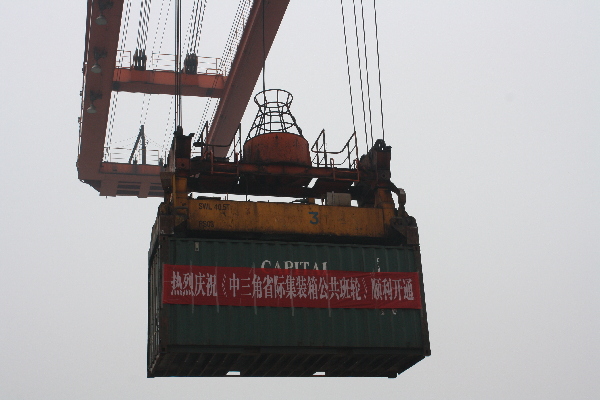 中三角省际集装箱公共班轮项目是市政府为贯彻落实长江经济带发展战略、实施长江中游航运中心建设发展规划而推进的鄂湘赣三省联动集装箱公共班轮航线运输项目。该项目实行定港停靠、定线运行、定班发航、定时靠港、定价发布等“五定”班轮模式,运营初期拟投入船舶2艘,航行区间为岳阳—武汉—九江,在岳阳城陵矶港、武汉阳逻港、江西九江港之间穿梭运行,而且可以根据港口条件及货源情况,适时停靠嘉鱼、纱帽、金口、花山、葛店、黄石、黄州、武穴等港口,双向对开。试运行期间每周2班,后期每周3班,总航程460公里。远期待航线运行稳定后,逐步加大航班密度。