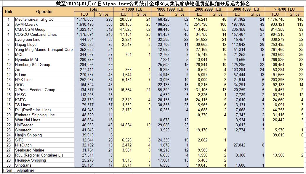 中国航贸网(Snet)最新统计显示,截至2017年01月01日,Alphaliner公司全球30大集装箱班轮租赁船队细分及运力排名信息中:前30大集装箱班轮租赁船队共计2207艘,与2016年12月份持平,合计运力达9781920TEU。